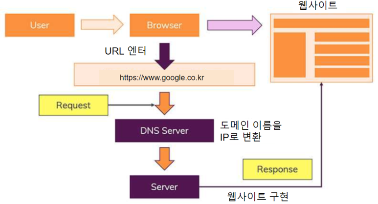 1. 사용자(Client)는 크롬, 엣지, 파이어폭스 등의 브라우저에 원하는 사이트의 주소(도메인 이름)를 입력하여 엔터
