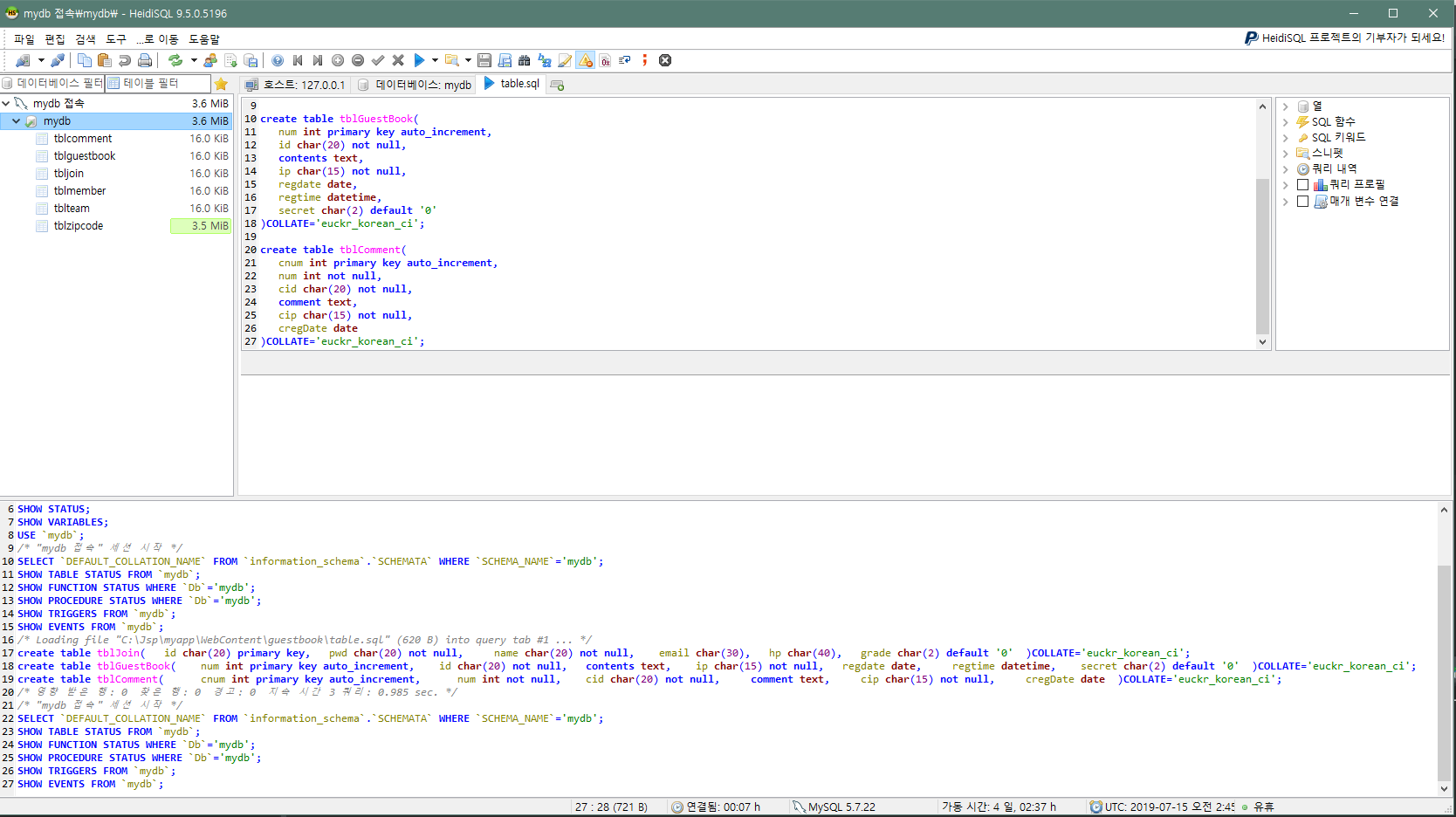 그럼 첫 번째 작업 순서로 먼저 Mysql에 접속하여 쿼리문을 돌리면 테이블들이 생성된다.