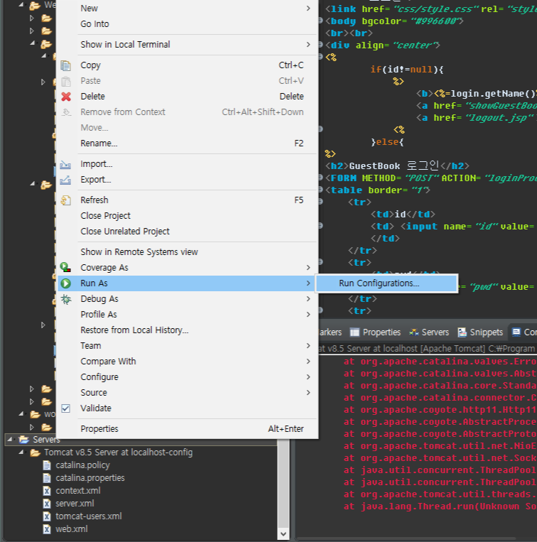 Run -> Run Configurations" 메뉴 > 연동하는 Tomcat 서버를 선택 > "Arguments" 탭 > VM arguments 에 아래의 항목을 추가한 후, "Apply" 버튼을 클릭하고 "Close" 버튼을 클릭.