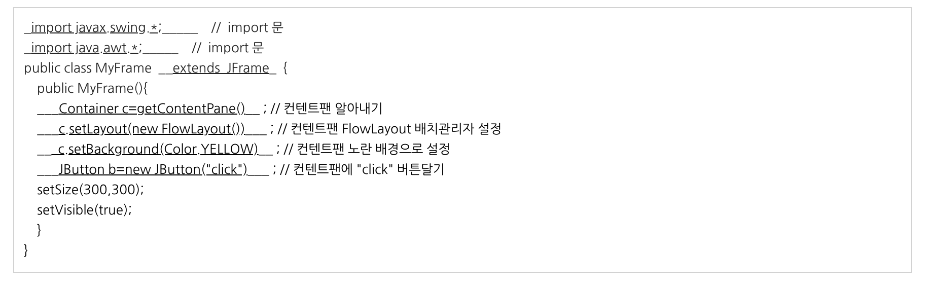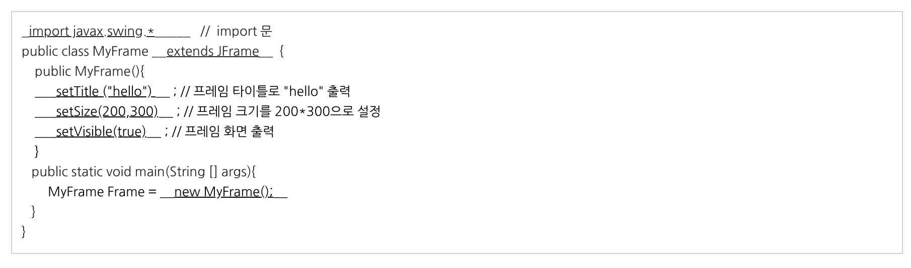 | 연습문제 9-7 | 200*300크기의 스윙프레임을 만든 코드이다. 빈칸에 필요한 코드를 채워라.