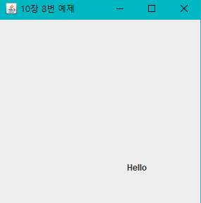 ※ "Hello" 문자열은 JLabel 컴포넌트로 만들어 컨텐트팬에 부착하고 상,하, 좌,우 키를 움직이면 키 방향으로 한 번에 10픽셀씩 움직인다 이를 위해 컨텐트팬의 배치관리자를 삭제하여야 한다. "Hello" 문자열을 초기에 (50,50) 위치에 출력하라.