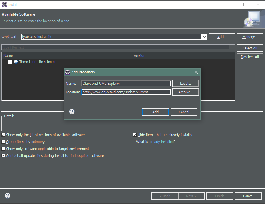 이클립스 > help > install new software > (Work with) add > 아래와 같이 입력한다.