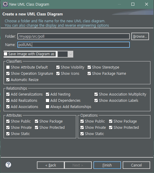 ObjectAid Class Diagram 을 선택하여 생성한 후 poll 폴더 안의 자바 프로그램들을 선택하여