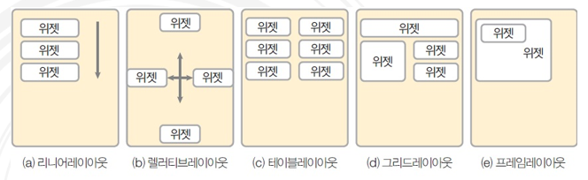 1) 리니어 (LinearLayout) : 가장 많이 사용. 왼쪽 위부터 아래쪽 또는 오른쪽으로 차례로 배치
