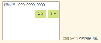 5-5 다음 화면의 XML 코드를 중복 리니어레이아웃과 렐러티브레이아웃으로 각각 작성해보자. 텍스트뷰 1개, 에디트텍스트 1개, 버튼 2개로 구성한다.