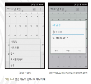 안드로이드 메뉴는 옵션 메뉴와 컨텍스트 메뉴 두 가지로 분류된다.