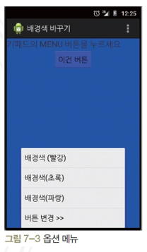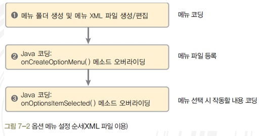 위 예제를 자바코드로만 코딩하려면, onCreateOptionsMenu() 메소드 안에서 메뉴 XML 파일에 접근하는 대신에 직접 Menu.add() 메소드로 메뉴 항목을 추가한다.