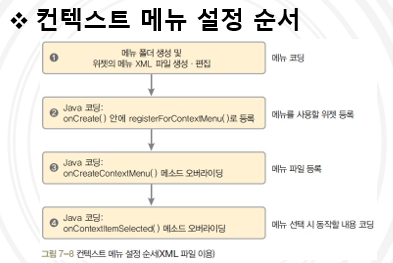 컨텍스트 메뉴가 나오게 할 위젯마다 별도의 파일로 만들어야 하며 메뉴 XML문법은 옵션 메뉴와 동일하다.