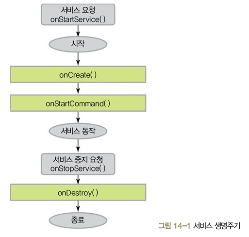 일반적으로 화면 없이 동작하는 프로그램으로 백그라운드 프로세스(Background Process)라고도 한다. 액티비티 응용 프로그램은 화면(액티비티)이 종료되면 동작하지 않지만 서비스는 백그라운드에서 실행되므로 화면과 상관없이 계속 동작한다.
