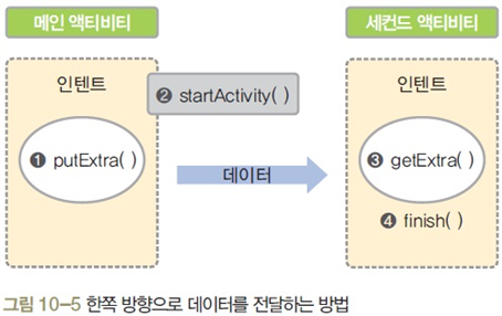 양방향 액티비티 : 메인 액티비티에서 세컨드 액티비티로 데이터를 넘긴 후에 다시 메인 액티비티로 데이터를 돌려주는 경우. 보낼 때 putExtra() , 받을 때 getExtra() 로 받는다. 주고받을 때 "" 안에다가 데이터형과 함께 보낸다.